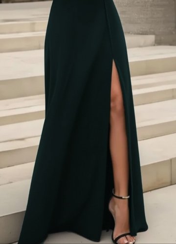 • Kadın uzun kollu madonna yakalı yırtmaç detaylı uzun ithal krep elbise