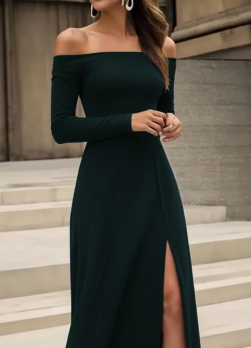 Kadın uzun kollu madonna yakalı yırtmaç detaylı uzun ithal krep elbise